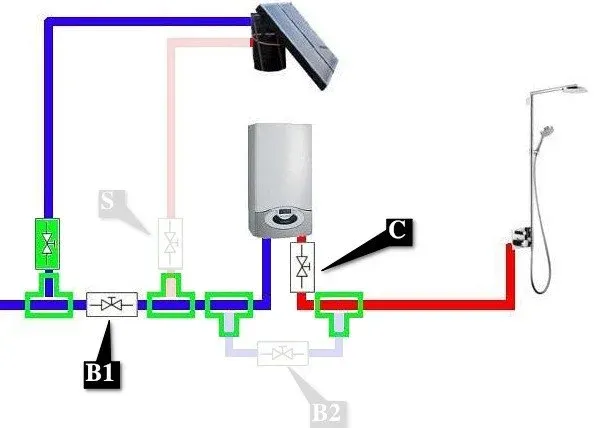 The "B1" key represents the water heater outlet that acts as a bypass or bridge to connect or isolate the solar thermal installation with the house