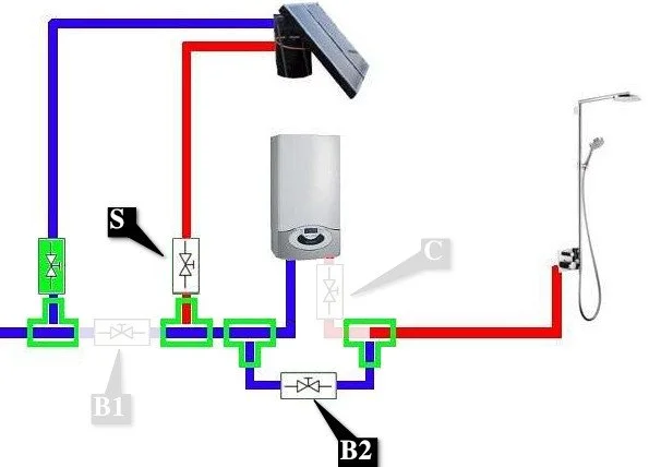 The "B2" key represents the water heater outlet that acts as a bypass or bridge to connect or isolate the auxiliary heater with the house
