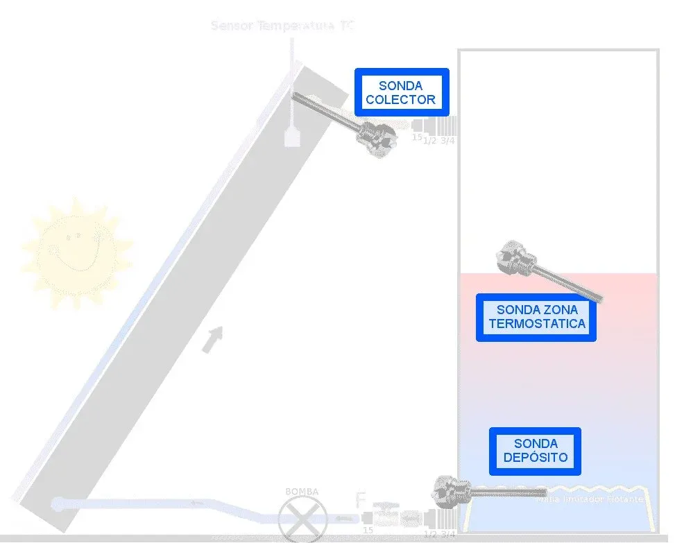 As can be seen graphically in the previous drawing, the probe in the collector is installed at the top of it, in the passage of water.
