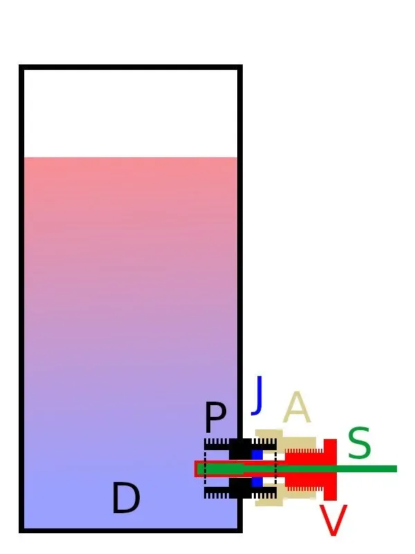 J) Common plumbing joint so that the water touches the sheath but does not come out to the outside