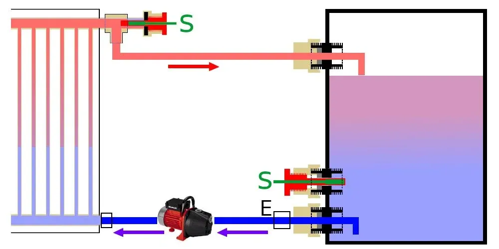 El agua entre el depósito y colector será movido por la bomba, que succionará la parte baja del depósito, y la empujará a la parte baja del colector.